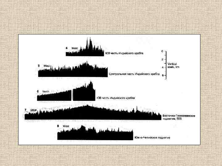 Типичные топографические профили через систему срединно-океанических хребтов (вертикальное увеличение 100: 1)