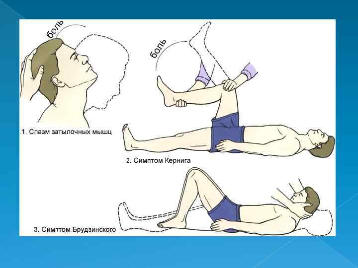 Менингеальды синдромға тән симптомдар: üМойын бұлшық еттерінің патологиялық тонусының жоғарылауынан эластикалығының бұзылуы, Науқас менингит кезінде тек қана мойнын бүге алмау ғана емес, сонымен қатар жаза да алмауы тән. üКерниг симптомы- науқас өзінің бүгілген аяқтарын жамбассан және тізе буындарын жаза алмауы. . üБрудзинский симптомы : жоғарғы – науқас , арқасына жатқан күйінде, басын кеудесіне иілтеді, сол кезде автоматты түрде аяқтарының бүгілуі; төменгі – науқас , бір аяғын бүккенде , еріксіз екінші аяғы сол қимылды қайталайды. üТактильді, иіс сезу, есту, ауырсыну тітіркендіргіштерін және жарқыраған жарықты көтере алмау üЖылағыштық üЖергілікті салданулар , парездер, сезімталдылықтың бұзылуы