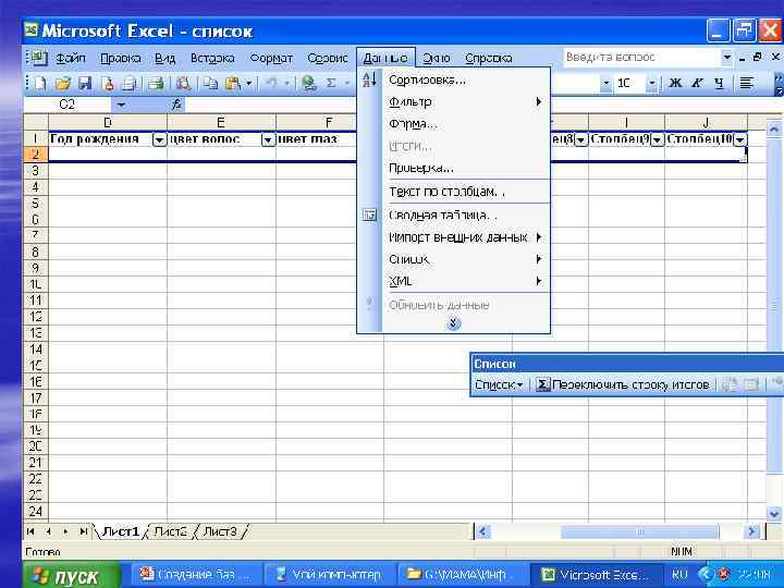 . Все действия со списками (базой данных) выполняет команда главного меню ДАННЫЕ