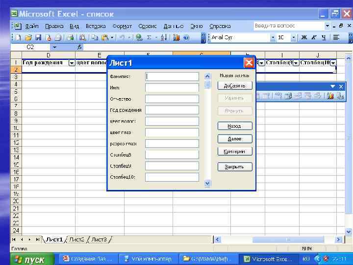 Вставка записей с помощью формы § Укажите ячейку списка, начиная с которой следует добавлять записи. § Выберите команду Форма в меню Данные. § Нажмите кнопку Добавить. § Введите поля новой записи, используя клавишу TAB для перемещения к следующему полю. Для перемещения к предыдущему полю используйте сочетание клавиш SHIFT+TAB.