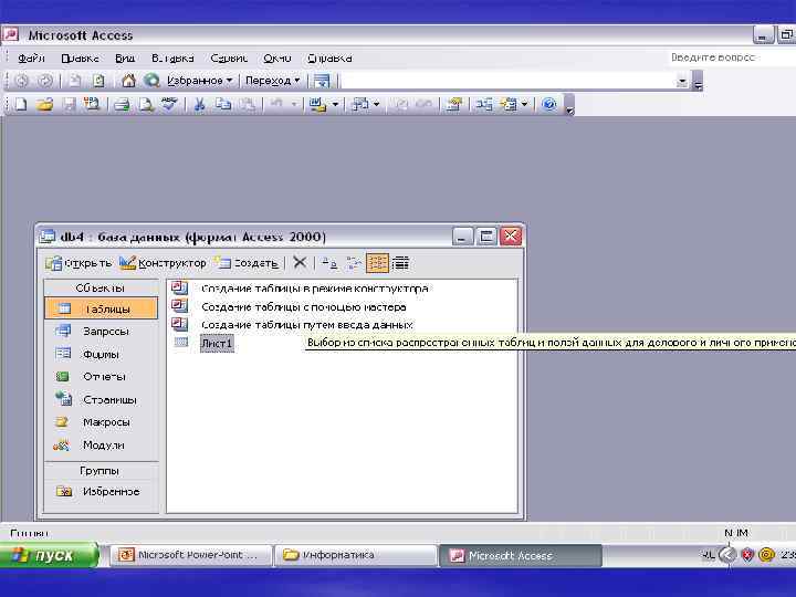 Создание таблицы путем ввода данных не предусматривает описания структуры таблицы. После выбора этого режима (режим таблицы) открывается пустая таблица, в которую можно ввести данные