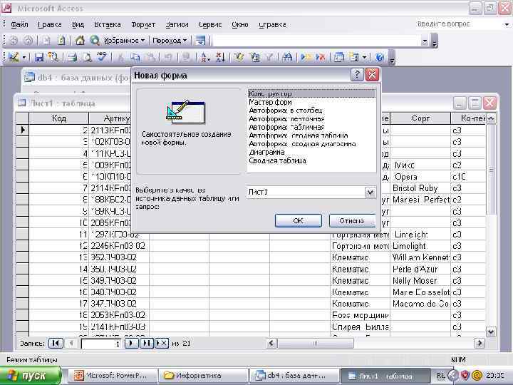 Создание таблицы в режиме конструктора