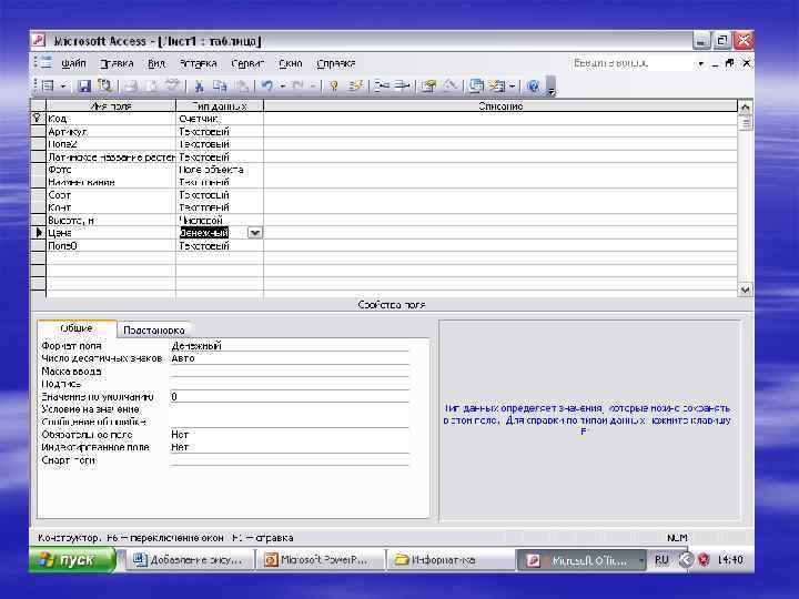 Основные свойства полей БД. § Имя поля — определяет как надо обращаться к данным поля (имена используются как заголовки таблиц). § Тип поля — определяет тип данных, которые могут содержаться в данном поле (текстовые, числовые, дата, Memo, денежный, счетчик и др. ). § Размер поля — определяет предельную длину данных, которые могут размещаться в поле. § Формат поля — способ форматирования данных в ячейках.
