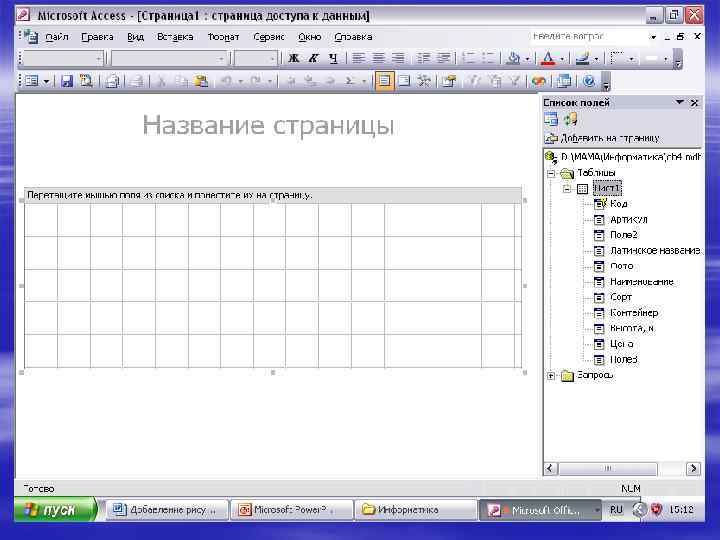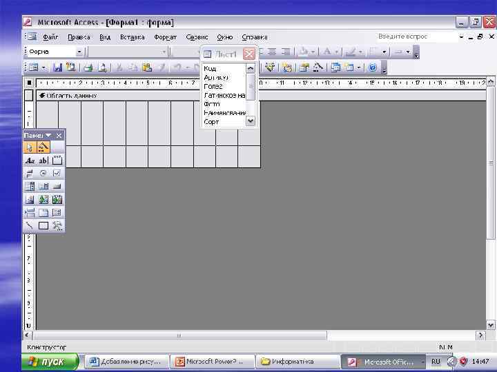 Внедрение существующего свободного объекта в форму или отчет § § Откройте форму или отчет в режиме конструктора (Режим конструктора. Окно, в котором отображается макет следующих объектов базы данных: таблицы, запросы, формы, отчеты, макросы и страницы доступа к данным. В режиме конструктора пользователь создает новые объекты базы данных или изменяет макеты существующих. ). Выполните одно из следующих действий.