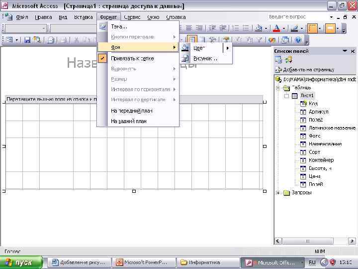 Добавление фонового рисунка на страницу доступа к данным – В меню Формат выберите команду Фон, а затем команду Рисунок. – В диалоговом окне Выбор рисунка убедитесь, что в поле со списком Тип файлов установлено значение Рисунки, и укажите файл рисунка, который нужно сделать фоновым. § Примечание. Для настройки фонового рисунка можно использовать следующие свойства, доступные в окне свойств: Background. Postion. X, Background. Position. Y и Background. Position. Repeat.