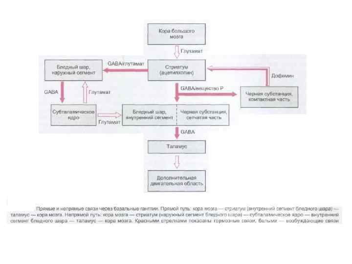 Главные связи базальных ганглиев. Возбуждающие влияния показаны красным, тормозные–черным. БШ – бледный шар (БШн–наружный сегмент, БШв–внутренний сегмент); ЧВ черное вещество (Кч компактная часть, Сч сетчатая часть); СТЯ субталамическое ядро; КСМ крыша среднего мозга; ПВЯ переднее вентральное ядро таламуса; ВЛЯ– вентролатеральное ядро таламуса; ВМЯ вентромедиальное ядро таламуса; ЦМПФЯ центральное медиальное и парафасцикулярное ядра таламуса; ДЯШ дорсальное ядро шва.