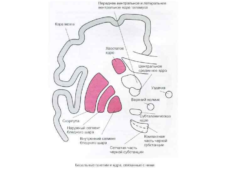 Базальные ганглии Совокупность парных образований расположенных в конечном мозге, в основании больших полушарий • Полосатое тело – хвостатое ядро и скорлупа • Бледный шар (pallidum) • Субталамическое ядро Возбуждающая афферентная импульсация от 3 основных источников: • Всех областей коры прямо и через таламус • Неспецифических интраламинарных ядер таламуса • Черного вещества