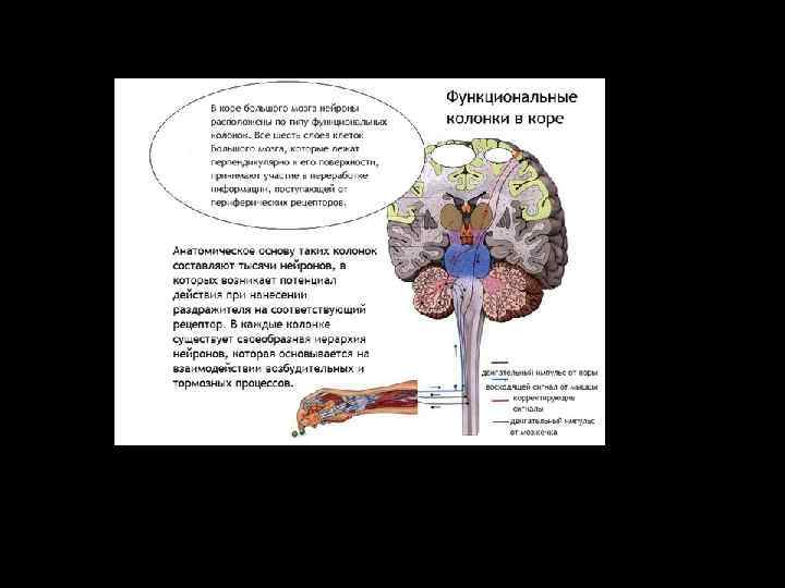 Функциональная организация коры • Функциональная единица коры - вертикальная колонка диаметром около 500 мкм – макромодуль. Колонка - зона распределения разветвлений одного восходящего афферентного таламокортикального волокна. Каждая колонка содержит до 1000 нейронных ансамблей – микромодули. Возбуждение одной колонки тормозит соседние колонки.