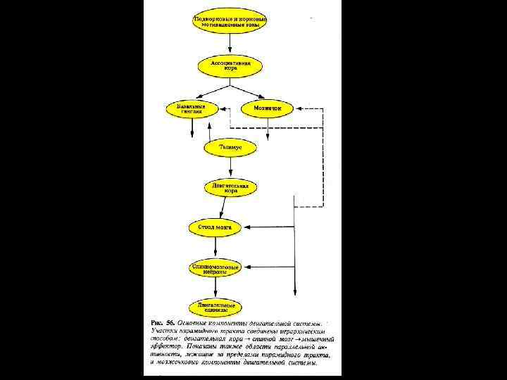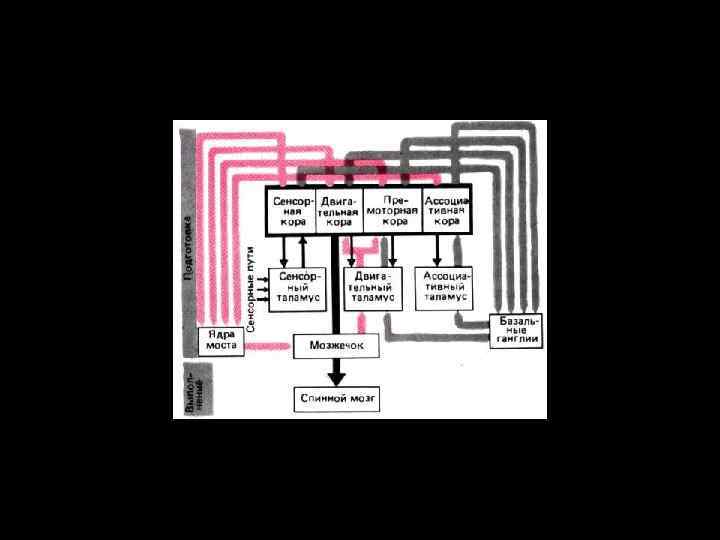 Схема связей в двигательной системе. Партнерство высших двигательных центров отражено размещением их на одном горизонтальном уровне. Основное внимание уделено той роли, которую играют в подготовке к движению внутренние петли, прежде всего проходящие через базальные ганглии и мозжечок