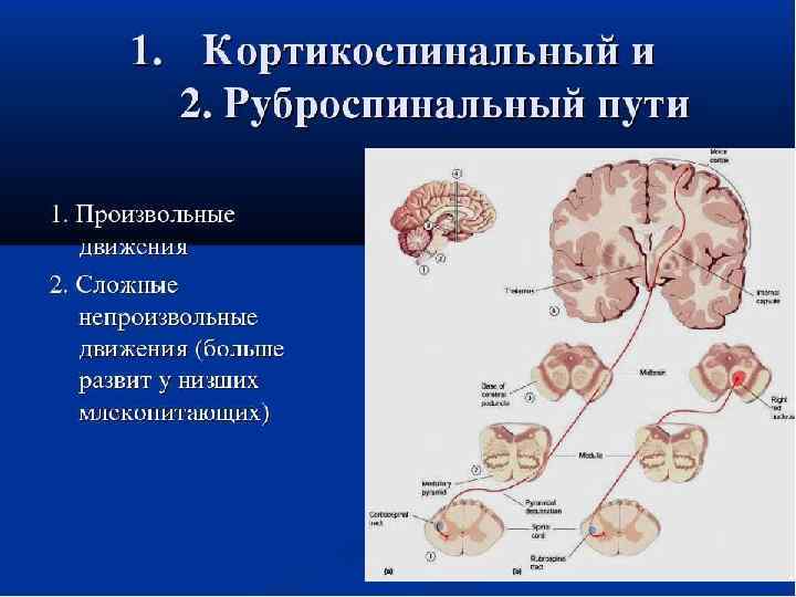Связи моторной коры с глубокими структурами головного мозга • • От моторной коры отходит большое количество тонких нервных волокон к глубоким структурам мозга и мозгового ствола (корково-ядерные волокна). От этих ядер сигналы по множеству путей поступают к другим ядрам стволовой части мозга, мозжечку и к спинному мозгу, в том числе: К хвостатому ядру и скорлупе, а от них в мозговой ствол и спинной мозг. К красному ядру и далее к спинному мозгу (красноядерно–спинномозговой путь). К ретикулярной формации и вестибулярным ядрам мозгового ствола и далее к спинному мозгу (через бульборетикуло–спинномозговые и пpеддвеpно–спинномозговые пути) и мозжечку (в составе ретикуломозжечкового и вестибуломозжечкового трактов). К ядрам моста, откуда мостомозжечковые пути и мосторетикуло–спинномозговые пути проводят сигналы к полушариям мозжечка и спинному мозгу. К ядрам нижней оливы и оттуда по оливомозжечковым волокнам к центральным областям мозжечка. Аксоны гигантских клеток Беца посылают короткие возвратные коллатерали к участкам коры, прилежащим к гигантским пирамидным клеткам. Эти коллатерали оказывают тормозящее влияние на соседние с клетками Беца нейроны в момент разряда гигантских клеток с целью усиления и выделения их сигналов. Таким образом, для координации мышечной активности базальные ядра, мозговой ствол и мозжечок постоянно получают сигналы из моторной коры и передают их в спинной мозг.
