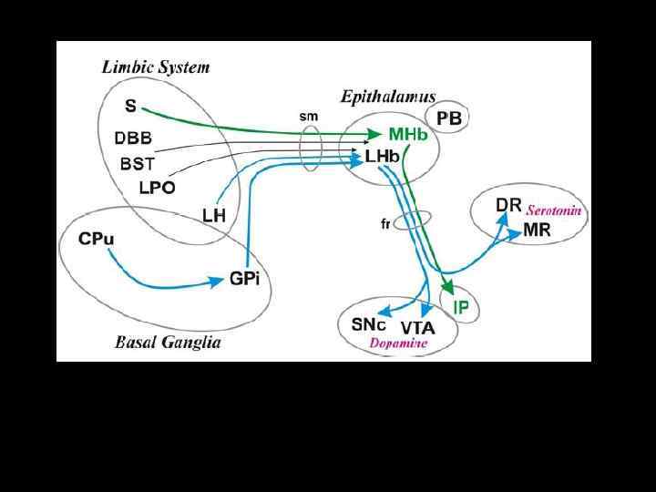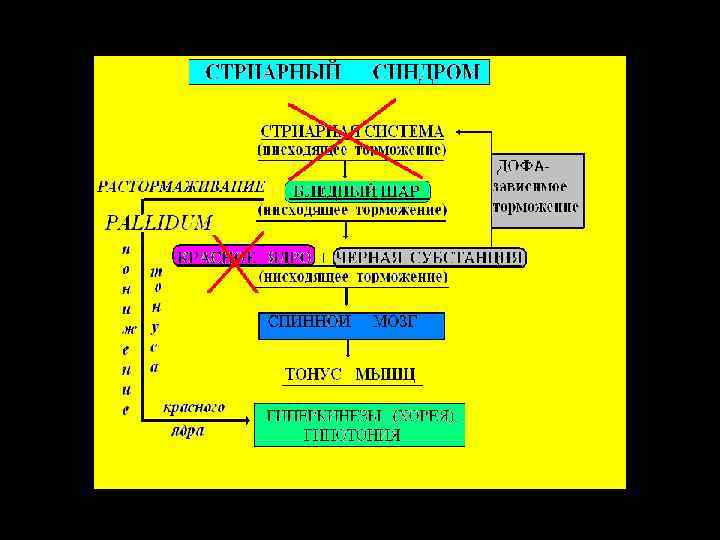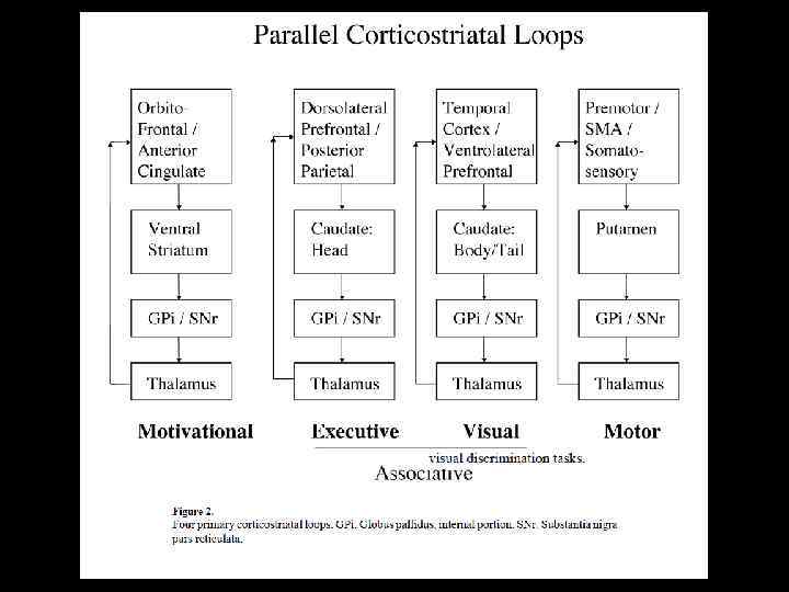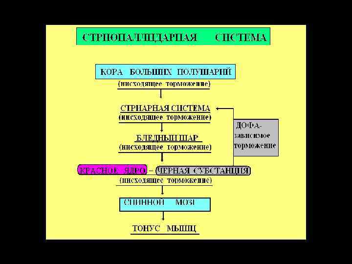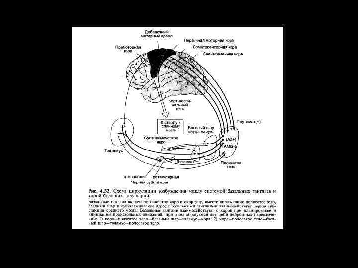 Кора глутамат в стриатуме - модульная организация (колона верхней конечности и т. п. ) Полосатое тело ГАМК Бледный шар (внутренний сегмент), Черное вещество (сетчатая часть) Черное вещество (компактна я часть) ГАМК Таламус глутамат Бледный шар (наружный сегмент), Субталамическое ядро