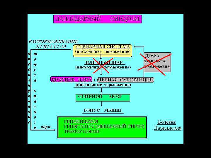 ЭФФЕКТЫ ПОРАЖЕНИЯ СТРИОПАЛЛИДАРНОЙ СИСТЕМЫ • Поражения хвостатого ядра: гиперкинезы- атетозы и хорея • (пляска святого Витта) • Поражения паллидум: обеднение двигательной активности при повышенном пластическом тонусе и треморе • (болезнь Паркинсона)