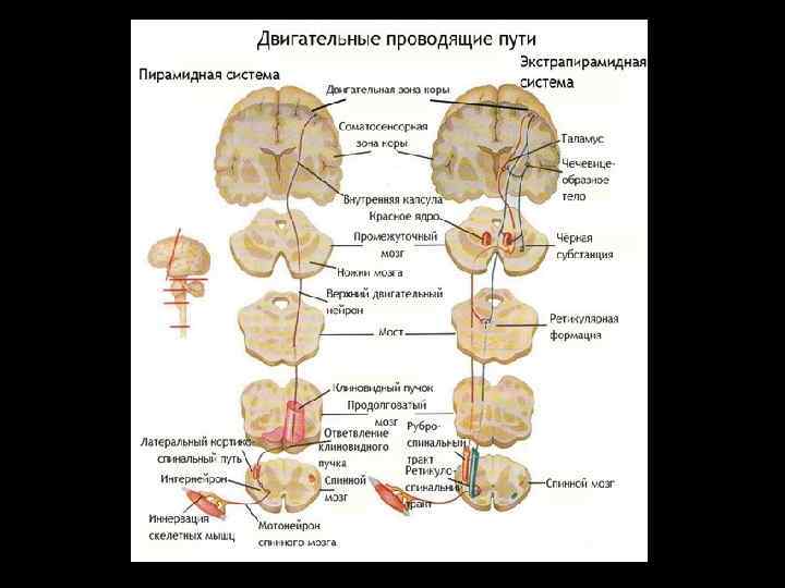 Схема организации двигательной системы. В иерархическом порядке представлены связи между центрами нервной системы, участвующими в регуляции позы и движения. Для упрощения некоторые высшие двигательные центры (мозжечок, базальные ганглии, двигательный отдел таламуса) опущены