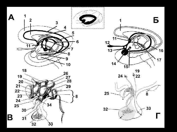 Расположение лимбической системы в виде кольца по краю неокортекса (А); афферентные и эфферентные связи лимбической системы (Б) 1 — поясная извилина, 2 — мозолистое тело, 3 — центральная борозда, 4 — теменная доля, 5 — шпорная борозда, 6 — затылочная доля, 7 — гиппокамп, 8 — парагиппокампальная извилина, 9 — височная доля, 10 — крючок, 11 — миндалевидное тело, I 2 — обонятельная луковица, 13 — передняя спайка, 14 — лобная доля, 16 — передний таламус, 16 — пояс, 17 — свод, 18 — терминальная полоска, 19 — сосцевидное тело, 20 — гипоталамус, 21 — медиальный пучок конечного мозга, 22 — перегородка