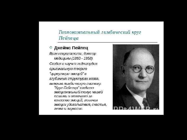 2 ЛИМБИЧЕСКИХ КРУГА n гипоталамус n БОЛЬШОЙ КРУГ ПЕЙПСА: гиппокамп - сводмамиллярные тела мамиллярноталамический пучок Викд’Азира - таламус - поясная извилина – гиппокамп МАЛЫЙ КРУГ НАУТА: миндалина - конечная полоска - гипоталамус перегородка - миндалина