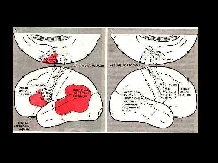 Расстройства речи. • • • Нарушение понимания или продуцирования речи при отсутствии расстройств слуха или артикуляции обозначают термином афазия. Она возникает при поражениях левого полушария. Повреждение в области Брока вызывает замедление речи, затруднённое произнесение слов, а при тяжёлом повреждении области Брока речь ограничена 2– 3 словами. Повреждение в области Вернике не изменяет произнесения слов, и индивидуумы иногда говорят очень много. Однако все, что они произносят — жаргон и неологизмы. Речь малопонятна, утрачивается понимание смысла сказанных или написанных слов (логорея). В некоторых случаях возникает афазия, когда пострадавший может говорить относительно хорошо и может понимать на слух смысл произнесённого слова, но не может соединять части слов вместе или вспоминать слова. Это проводящая афазия, потому что поражаются пути между зонами Вернике и Брока. Поражение угловой извилины в левом полушарии (области Вернике или Брока интактны) не вызывает трудностей с речью или пониманием произносимых слов, но нарушается понимание печатной речи или рисунков из-за того, что страдает обработка и передача информации в область Вернике (безликая афазия).