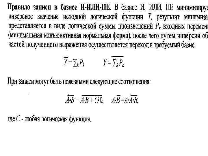 • Правило записи в базисе И-НЕ: Минимизированная в базисе И, ИЛИ, НЕ • логическая функция Y представляется в виде логической суммы произведений Рк входных переменных (минимальная дизъюнктивная нормальная форма), после чего используется формула закона двойственности: • Y = Σk Рк = HE (Пk НЕРк) • При записи могут оказаться полезными следующие соотношения: • НЕА= НЕ (А· 1), НЕΑ=НЕ(Α·Α), Α·НЕΒ=Α·НЕ(Α·Β), Α·НЕΒ+НЕΑ·Β = НЕ{НЕ[Α·НЕ(Α·Β)]·НЕ[НЕ(Α·Β)·Β]}.