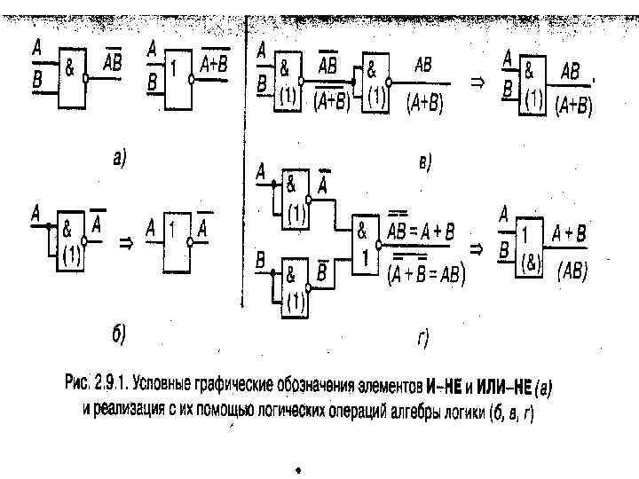 • Минимальный базис составляют две пары операции ИЛИ, НЕ и И, НЕ. Практического внимания заслуживают минимальные базисы, представляющие собой только одну операцию. К ним относятся операции логического умножения с отрицанием (И НЕ, штрих Шеффера) и логического сложения с отрицанием (ИЛИ НЕ, стрелка Пирса). Условные графические обозна чения логических элементов И НЕ, ИЛИ НЕ изображены на рисунках, представленных ниже (2. 9. 1, а). • Для подтверждения функциональной полноты каждой из операций И НЕ, ИЛИ НЕ на рис. 2. 9. 1, б, в, г показана реализация основных логических операций НЕ, И, ИЛИ с помощью логических элементов И НЕ и ИЛИ НЕ (нижний ряд обозначений в круглых скобках).