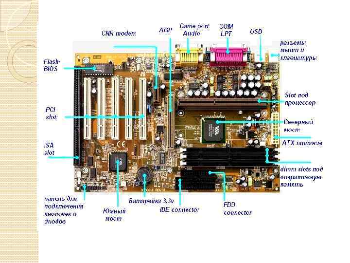 Материнская плата На ней расположены: чипсет (микропроцессорный комплект) - набор микросхем, которые руководят работой внутренних устройств ПК и определяют основные функциональные возможности материнской платы; процессор - основная микросхема, выполняющая математические и логические операции; оперативное запоминающее устройство (ОЗУ) набор микросхем, предназначенных для временного сохранения данных, пока включен компьютер; постоянное запоминающее устройство (ПЗУ) микросхема, предназначенная для долговременного хранения данных, даже при отключенном компьютере; разъемы для подсоединения дополнительных устройств (слоты).