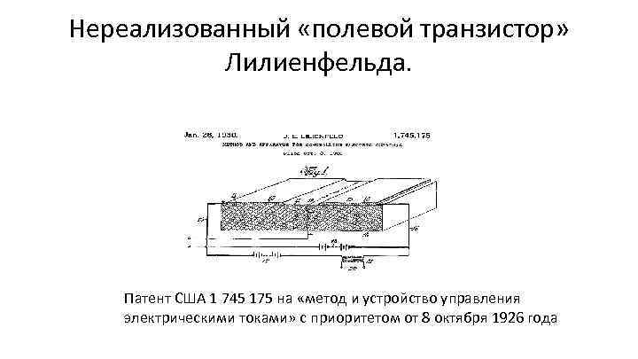 Нереализованный «полевой транзистор» Лилиенфельда. Патент США 1 745 175 на «метод и устройство управления электрическими токами» с приоритетом от 8 октября 1926 года