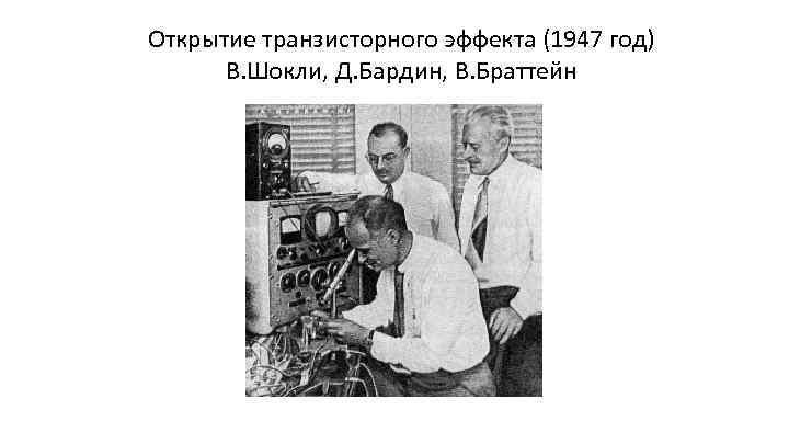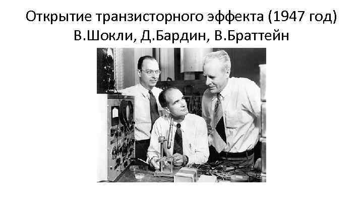 Открытие транзисторного эффекта (1947 год) В. Шокли, Д. Бардин, В. Браттейн
