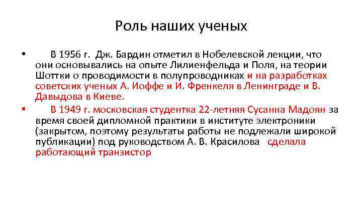 Роль наших ученых • В 1956 г. Дж. Бардин отметил в Нобелевской лекции, что они основывались на опыте Лилиенфельда и Поля, на теории Шоттки о проводимости в полупроводниках и на разработках советских ученых А. Иоффе и И. Френкеля в Ленинграде и В. Давыдова в Киеве. • В 1949 г. московская студентка 22 -летняя Сусанна Мадоян за время своей дипломной практики в институте электроники (закрытом, поэтому результаты работы не подлежали широкой публикации) под руководством А. В. Красилова сделала работающий транзистор