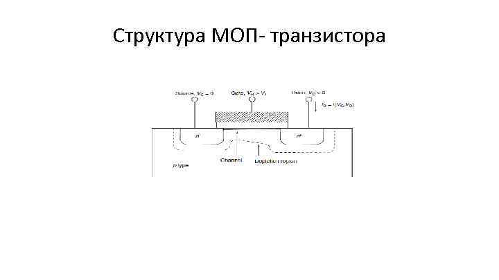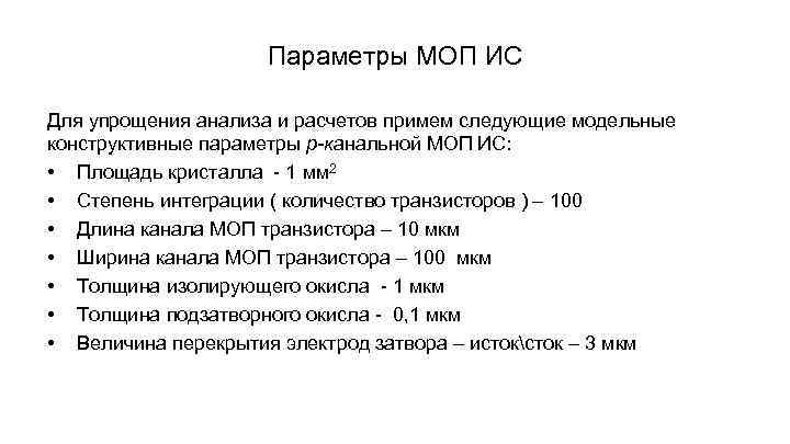 Параметры МОП ИС Для упрощения анализа и расчетов примем следующие модельные конструктивные параметры р-канальной МОП ИС: • Площадь кристалла - 1 мм 2 • Степень интеграции ( количество транзисторов ) – 100 • Длина канала МОП транзистора – 10 мкм • Ширина канала МОП транзистора – 100 мкм • Толщина изолирующего окисла - 1 мкм • Толщина подзатворного окисла - 0, 1 мкм • Величина перекрытия электрод затвора – истоксток – 3 мкм