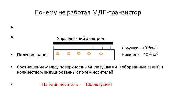 Почему не работал МДП-транзистор • Управляющий электрод Ловушки – 1014 см-2 Носители – 1012 см-2 • Полупроводник • Соотношение между поверхностными ловушками (оборванные связи) и количеством индуцированных полем носителей • На один носитель - 100 ловушек!