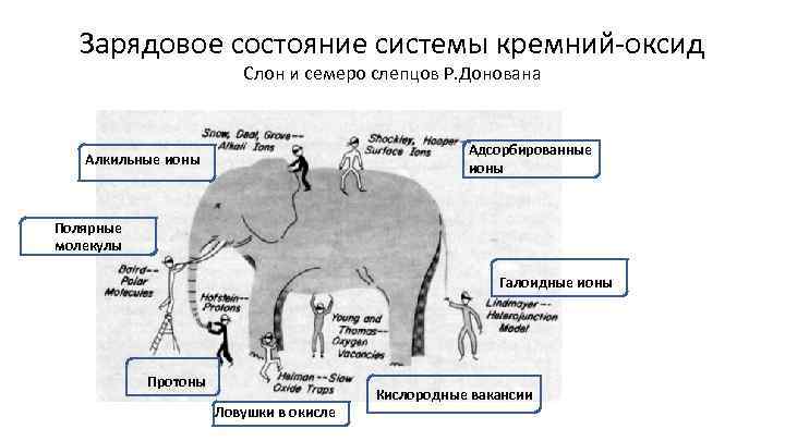 Зарядовое состояние системы кремний-оксид Слон и семеро слепцов Р. Донована Адсорбированные ионы Алкильные ионы Полярные молекулы Галоидные ионы Протоны Ловушки в окисле Кислородные вакансии