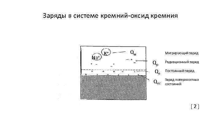 Заряды в системе кремний-оксид кремния Na+ K+ Qм Мигрирующий заряд Qр Qп Qпс Радиационный заряд Постоянный заряд Заряд поверхностных состояний [ 2 ]