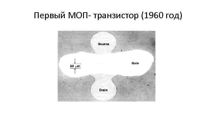 Почему стал работать МОП-транзистор • Эффект пассивации поверхности оксидом (1960 -е гг. М. Аталла и Д. Кант ) • Управляющий электрод • Оксид кремния Кремний • • Ловушки – 1011 см-2 Носители – 1012 см-2 Соотношение между поверхностными ловушками (оборванные связи) и количеством индуцированных полем носителей На одну ловушку - 10 носителей!