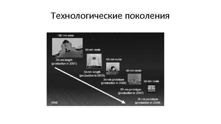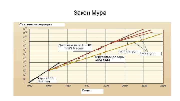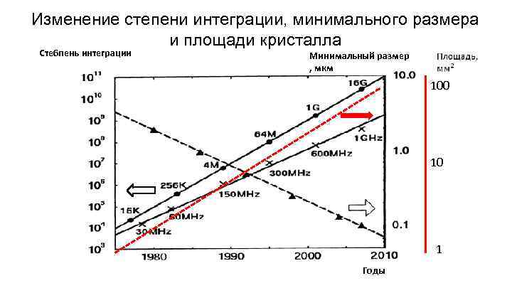 Изменение степени интеграции, минимального размера и площади кристалла Сте 6 пень интеграции Минимальный размер , мкм 100 10 1 Годы