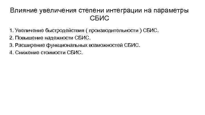 Влияние увеличения степени интеграции на параметры СБИС 1. Увеличение быстродействия ( производительности ) СБИС. 2. Повышение надежности СБИС. 3. Расширение функциональных возможностей СБИС. 4. Снижение стоимости СБИС.