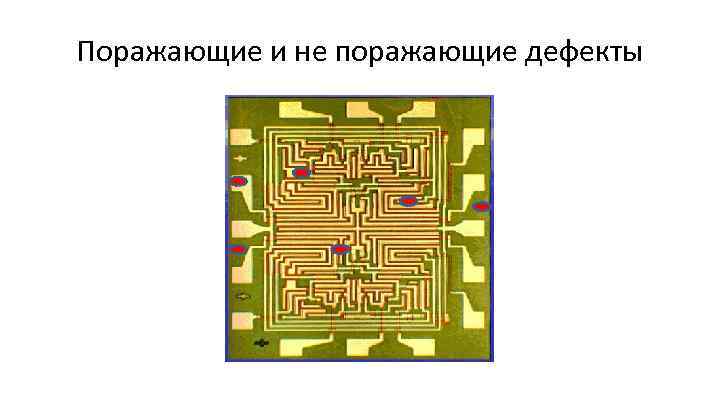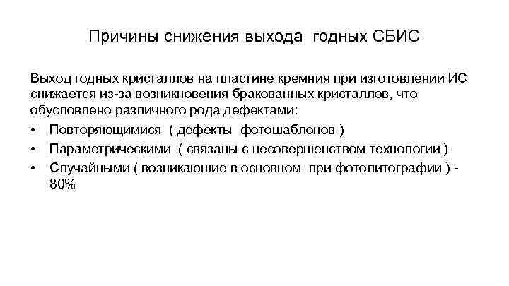 Причины снижения выхода годных СБИС Выход годных кристаллов на пластине кремния при изготовлении ИС снижается из-за возникновения бракованных кристаллов, что обусловлено различного рода дефектами: • Повторяющимися ( дефекты фотошаблонов ) • Параметрическими ( связаны с несовершенством технологии ) • Случайными ( возникающие в основном при фотолитографии ) 80%