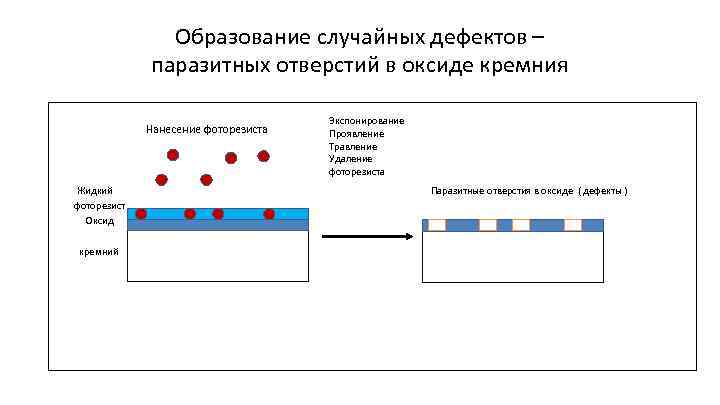 Образование случайных дефектов – паразитных отверстий в оксиде кремния Нанесение фоторезиста Экспонирование Проявление Травление Удаление фоторезиста Жидкий Паразитные отверстия в оксиде ( дефекты ) фоторезист Оксид кремний