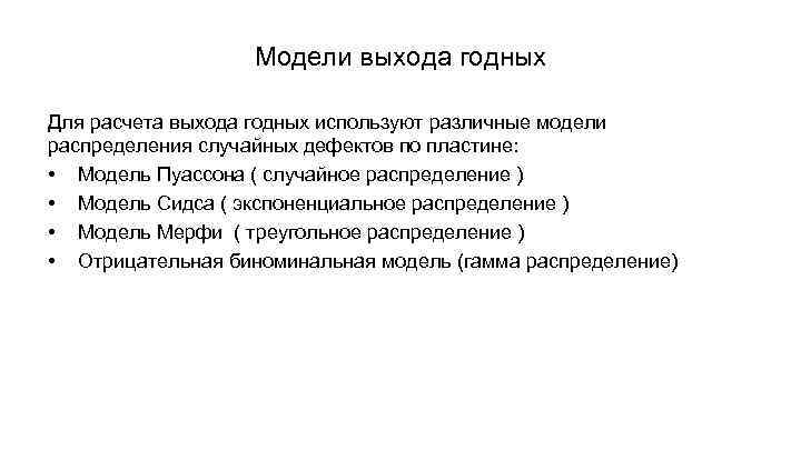 Модели выхода годных Для расчета выхода годных используют различные модели распределения случайных дефектов по пластине: • Модель Пуассона ( случайное распределение ) • Модель Сидса ( экспоненциальное распределение ) • Модель Мерфи ( треугольное распределение ) • Отрицательная биноминальная модель (гамма распределение)