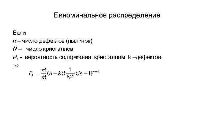 Биноминальное распределение Если n – число дефектов (пылинок) N – число кристаллов Pк - вероятность содержания кристаллом k –дефектов то