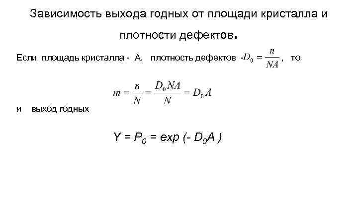 Зависимость выхода годных от площади кристалла и плотности дефектов . Если площадь кристалла - A, плотность дефектов - и выход годных Y = P 0 = ехр (- D 0 A ) , то