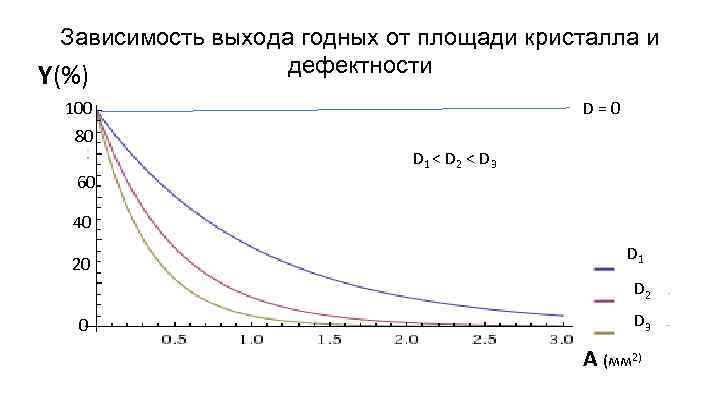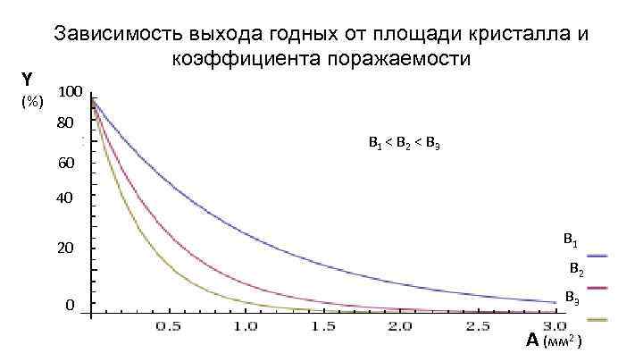 Y (%) Зависимость выхода годных от площади кристалла и коэффициента поражаемости 100 80 60 B 1 < B 2 < B 3 40 20 B 1 B 2 0 B 3 A (мм 2 )