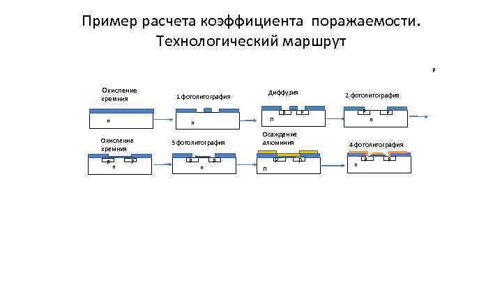 Пример расчета коэффициента поражаемости. Технологический маршрут р Окисление кремния n р 3 фотолитография n р п р р Осаждение алюминия р р 2 фотолитография р п пп nп п п n р Диффузия 1 фотолитография р 4 фотолитография n р р
