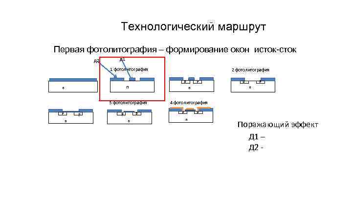 Технологический маршрут Первая фотолитография – формирование окон д 2 д 1 1 фотолитография 2 фотолитография р р п п nп n р р n n 3 фотолитография р исток-сток 4 фотолитография р р n Поражающий эффект Д 1 – Д 2 -
