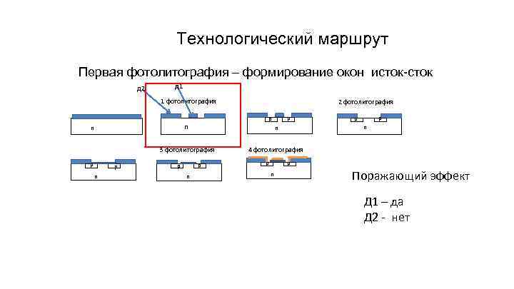Технологический маршрут Первая фотолитография – формирование окон д 2 д 1 1 фотолитография 2 фотолитография р р п п nп n р р n n 3 фотолитография р исток-сток 4 фотолитография р р n Поражающий эффект Д 1 – да Д 2 - нет