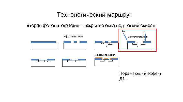Технологический маршрут Вторая фотолитография – вскрытие окна под тонкий окисел д 1 1 фотолитография д 1 2 фотолитография р р п п 4 фотолитография р р Поражающий эффект Д 1 -