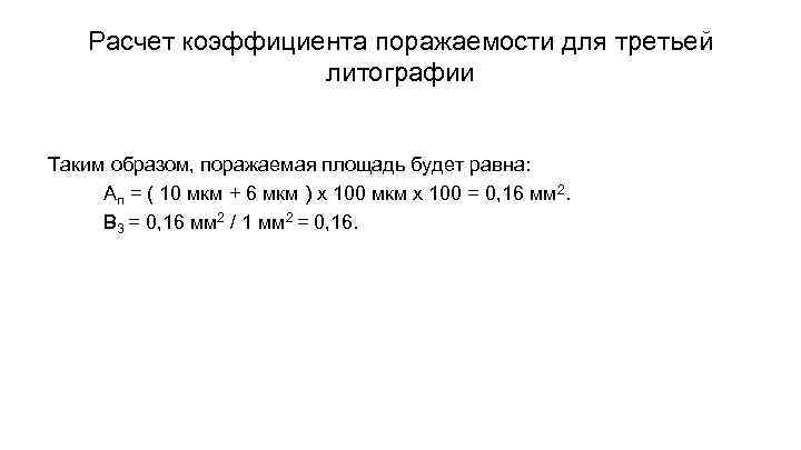Расчет коэффициента поражаемости для третьей литографии Таким образом, поражаемая площадь будет равна: Ап = ( 10 мкм + 6 мкм ) х 100 мкм х 100 = 0, 16 мм 2. В 3 = 0, 16 мм 2 / 1 мм 2 = 0, 16.