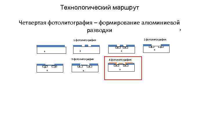 Технологический маршрут Четвертая фотолитография – формирование алюминиевой р разводки 2 фотолитография 1 фотолитография р р nп п пп п n n 3 фотолитография р р n 4 фотолитография р р n р
