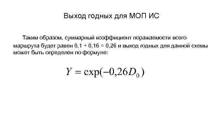 Выход годных для МОП ИС Таким образом, суммарный коэффициент поражаемости всего маршрута будет равен 0, 1 + 0, 16 = 0, 26 и выход годных для данной схемы может быть определен по формуле: