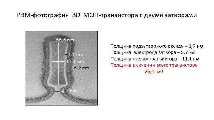 РЭМ-фотография 3 D МОП-транзистора с двумя затворами Толщина подзатворного оксида – 1, 7 нм Толщина электрода затвора – 5, 7 нм Толщина «тела» транзистора – 11, 1 нм Толщина в сечении всего транзистора 26, 4 нм!