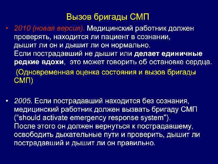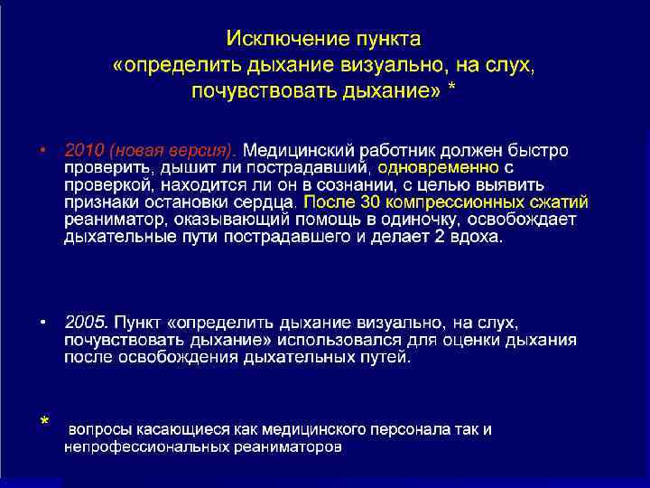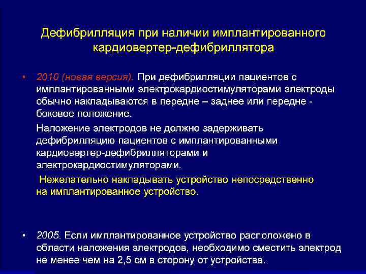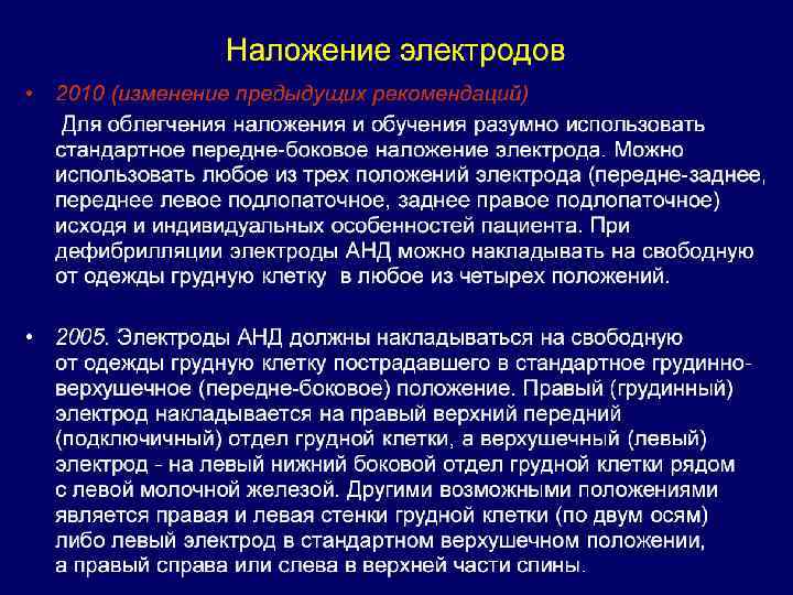 ИЗМЕНЕНИЯ 2010 года n применение для дефибрилляции только одного разряда (предпочтение следует отдавать бифазным моделям дефибрилляторов), после которого должна следовать немедленная (без проверки наличия сердечного ритма) СЛР в течение 2 мин. 9