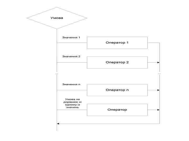 Оператор switch (перемикач) призначений для розгалуження процесу обчислень на декілька напрямів. Формат оператора: switch ( вираз ) { case константний_вираз_1: [список_операторів_1] case константний_вираз_2: [список_операторів_2] ……. . case константний_вираз_n: [список_операторів_n] [default: оператори ] }