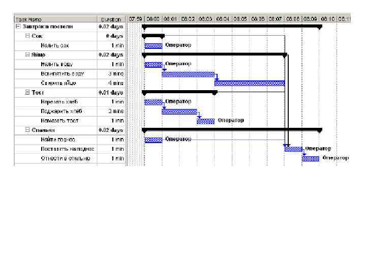 • На следующем шаге мы должны учесть зависимости между работами, например, нельзя жарить хлеб, пока мы его не нарезали. • С учетом зависимостей мы получим следующую диаграмму расписания нашего проекта